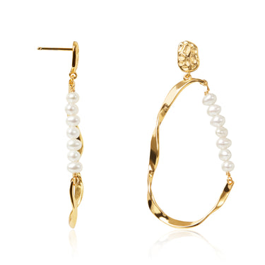 These simple statement earrings enhance every look. Understated pearls entwined in hammered gold add a delicate touch of vintage to a modern hoop. A contemporary take on a classic style.