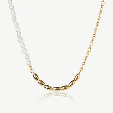 This necklace adds glamour to any outfit. Featuring 4mm pearls set on a paperlink which is finished with molten gold beads.