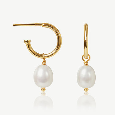 Everyday hoops with a pearl pop. These 18ct gold plated earrings feature hand-finished freshwater pearls that move freely from their sleek, modern setting. A chic balance of style and simplicity, perfect for daily wear.
