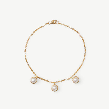 Three bezel-set freshwater pearls dangle delicately from a fine 18ct gold plated chain in this playful and polished bracelet. Ideal for adding a subtle touch of glamour to any look.