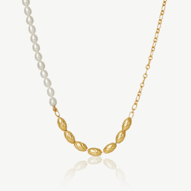 A pearl necklace that pops. This asymmetrical necklace contrasts a row of freshwater pearls with textured 18ct gold plated beads and chain. A fresh take on pearl styling that feels balanced and bold.