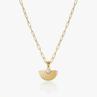 Fan-shaped gold pendant necklace with pearl for timeless contrast.